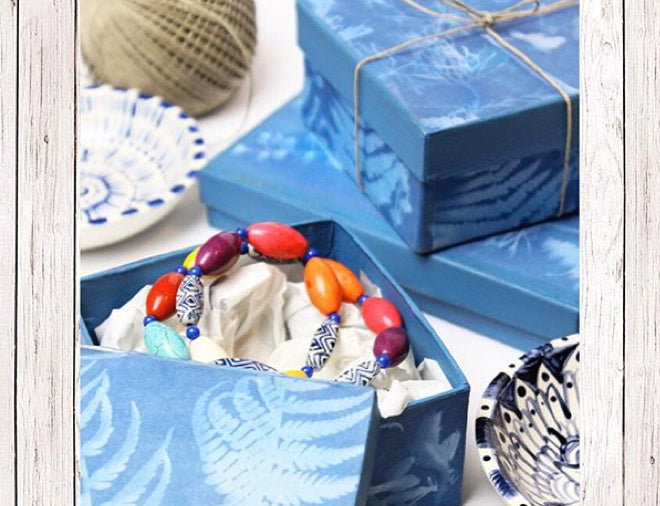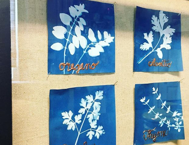 Simply select the subject of your print from a wide array of natural or manmade objects, place it on top of the paper, and expose it to sunlight, or a UV lamp, until the paper turns light blue in color (1-3 minutes depending on intensity of sunlight).  Once exposure is complete, submerge the paper in water to stop the exposure process, remove print from water and set aside to dry.  It’s that easy!